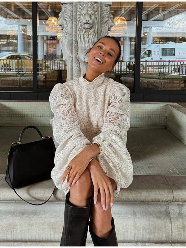 This white lace dress exudes elegance with its high neck, flared sleeves, and pleat mini silhouette, perfect for club evening parties.